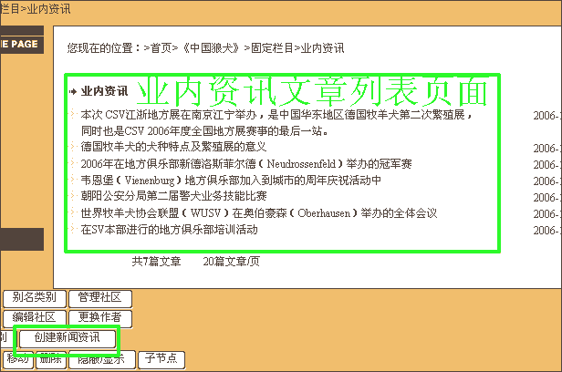 3.從這個(gè)頁面出發(fā),繼續(xù)尋找,來到我們要添加文章的界面。例如,我們要在“業(yè)內(nèi)資訊”欄目下添加新文章,那么就要進(jìn)入到“業(yè)內(nèi)資訊”文章列表所在頁面。在頁面下方會(huì)見到同上圖一樣的一群按鈕。注意:一定要進(jìn)入真正的列表頁面,而不是首頁或其父類頁面。列表頁才是我們的“操作車間”。對(duì)于這些按鈕不要眼花,我們常用到的僅僅是其中兩個(gè)而已。點(diǎn)擊“創(chuàng)建新聞資訊”按鈕,進(jìn)入編輯頁面: