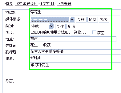 網(wǎng)站吸引瀏覽者的一個(gè)重要途徑就是其內(nèi)容的更新速度,而EDN系統(tǒng)的好處就在于它具有方便快捷的內(nèi)容添加方式。下面的步驟將把這個(gè)過程一一剖析,讀完這篇文章,相信您一定能夠自如地添加您想展示的任何內(nèi)容。在看這篇文章的過程中,請(qǐng)注意綠色方框和綠色文字,這些是操作過程的生動(dòng)體現(xiàn)。例如,向頁面添加一篇文章《落花生》。