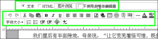 6.先演示使用媒體編輯器的情況。在不勾選“不使用多媒體編輯器”時(shí),就是使用媒體編輯器,這時(shí)的編輯是可視化的,只要按照我們平常在Microsoft office word中寫出來的結(jié)構(gòu)原樣粘貼,上傳以后的頁面也會(huì)如此排列。這種方式比較簡單、明了,所見即所得,適合HTML基礎(chǔ)薄弱的用戶,但缺點(diǎn)是對(duì)圖片文字位置的控制能力較差,產(chǎn)生很多垃圾代碼,占用資源也很大。文字編輯功能同我們?nèi)粘J褂玫腗icrosoft office word幾乎是一樣的,可以進(jìn)行字號(hào)、大小、顏色等修改。編輯器下面的“加號(hào)”和“減號(hào)”可以使編輯窗口擴(kuò)大或縮小,有利于編輯的方便。
