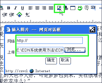 7.接著插入圖片。先用鼠標(biāo)點(diǎn)擊在編輯器內(nèi)需要插入圖片的位置,點(diǎn)擊上面的插入圖片標(biāo)記,然后彈出“插入圖片”對(duì)話框??梢园丫W(wǎng)絡(luò)上的圖片地址填入;也可以雙擊“瀏覽”,從本機(jī)上傳一張圖片。我上傳了本地一張圖片。最后點(diǎn)“確定”: