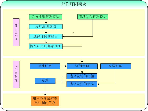 如要使用該模塊,首先要稱為注冊會員,選取要訂閱的欄目后提交郵箱地址。在管理后臺,管理員選擇要發(fā)送的郵箱地址,可以選擇一次選擇多個(gè)郵箱,然后選取要發(fā)送的信息,可以一次選擇多項(xiàng)信息,選取完成后發(fā)送。用戶可以登陸郵箱來查閱訂制的信息。管理員也可以在訂閱管理頁面對用戶提交的郵箱進(jìn)行刪除操作。