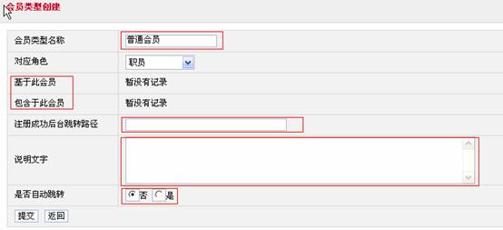 會員類型名稱可以任意填寫,在這里我們填寫的是普通會員,可以設(shè)置該會員擁有的角色,設(shè)置注冊成功是否跳轉(zhuǎn)和跳轉(zhuǎn)的路徑以及說明文字,另外還有基于此會員和包含于此會員的選擇,因為普通會員是我們創(chuàng)建的第一個會員類型所有此兩項都沒有記錄。