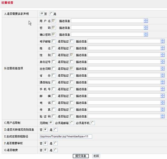 用戶名、密碼和確認(rèn)密碼事必填項所以默認(rèn)選中而且無法更改其他信息可以根據(jù)網(wǎng)站需求進(jìn)行選擇,而且驗證也可以進(jìn)行選擇是否驗證,也可以加入對前邊注冊信息的描述。