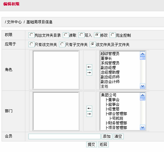 3. 可以設(shè)置文件管理的角色,這里為了方便說明,只添加了兩個(gè)角色,而且角色的分配可以是多個(gè)的,如下圖:我們可以給超級(jí)管理員這個(gè)角色賦予此權(quán)限,也可以把總經(jīng)理也添加到此列中,此時(shí),就角色而言,超級(jí)管理員和總經(jīng)理的權(quán)限相同;