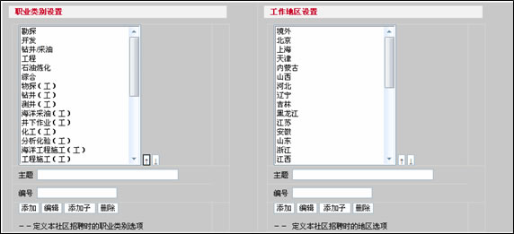 可以添加和顯示不同的職業(yè)類別和工作地區(qū),并可以給職業(yè)類別和地區(qū)添加子類別: