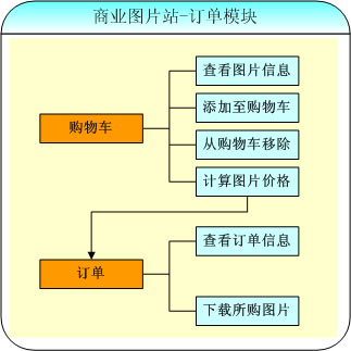 商業(yè)圖片站-訂單模塊是用來(lái)實(shí)現(xiàn)用購(gòu)物車(chē)選購(gòu)圖片、結(jié)賬并通過(guò)訂單下載所購(gòu)圖片的功能,該模塊包括購(gòu)物車(chē)部分(查看所購(gòu)圖片信息、添加至購(gòu)物車(chē)、從購(gòu)物車(chē)中移除和計(jì)算圖片價(jià)格)和訂單部分(查看所購(gòu)買(mǎi)訂單的信息和下載所購(gòu)買(mǎi)的圖片)。