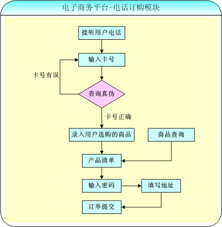 電子商務(wù)平臺-電話訂購模塊的功能與網(wǎng)上購物的功能有一定的差別,該功能目前只針對會員卡。顧客打進電話,呼叫坐席在我們的電話訂購功能里面輸入顧客的會員卡號、所購商品、郵寄地址。當(dāng)訂單提交成功以后,系統(tǒng)數(shù)據(jù)庫中就會相應(yīng)地扣除用戶所購商品的金額,當(dāng)貨物送到以后,用戶需用會員卡在我們的手持終端刷卡,從卡中扣除相應(yīng)的錢數(shù),此時,一次完整的電話訂購交易結(jié)束。