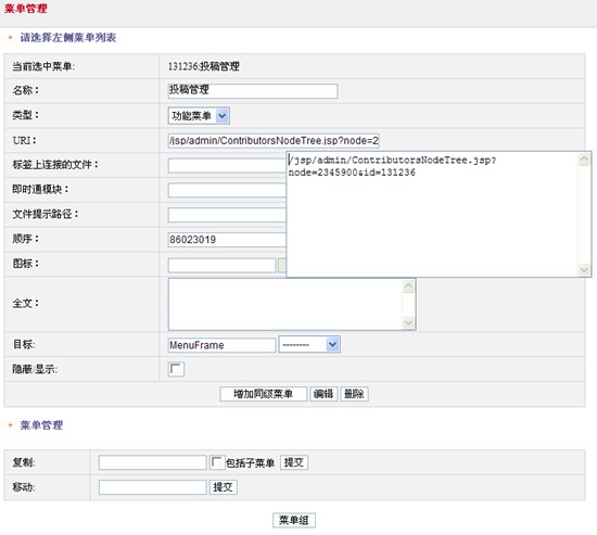 進入網(wǎng)站后臺管理,點擊系統(tǒng)管理創(chuàng)建投稿管理的功能欄目菜單;在創(chuàng)建功能菜單的時候在目標處填寫:MenuFrame,讓投稿管理的功能菜單在頁面的左側(cè)顯示;創(chuàng)建投稿功能如下圖所示: