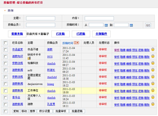 點擊投稿管理進入投稿管理頁面,在頁面的左側(cè)會自動提取投稿的欄目菜單,可以分別瀏覽各個欄目下的投稿,然后進行管理,如下圖所示: