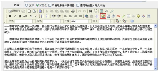 內(nèi)容圖片的上傳是在上傳欄目內(nèi)容時在編輯器里上傳的圖片,例如:上傳新聞時新聞內(nèi)容中含有圖片,該圖片是在新聞上傳頁面中的編輯器里完成的,如圖: 如想在該新聞內(nèi)容中添加圖片,點擊編輯器中的“圖片”按鈕上傳圖片即可,圖片上傳詳細見7.1節(jié)中“內(nèi)容的前臺管理”下編輯器