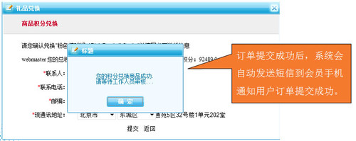 如會(huì)員想要兌換此商品,點(diǎn)擊“立即兌換”,進(jìn)入兌換頁(yè)面,該頁(yè)面顯示出兌換的商品及所需積分,并需要會(huì)員確認(rèn)送貨信息。點(diǎn)擊“提交”即完成兌換,并生成兌換訂單。