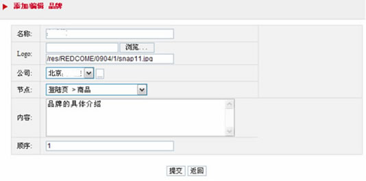 圖上可以添加品牌的名稱logo圖片,公司和要顯示的節(jié)點位置(節(jié)點是事先添加好的,用戶之間選擇即可),對品牌的具體的說明以及在品牌列表中顯示的位置。添加完這些信息以后,點擊添加按鈕,即可添加了一個品牌。