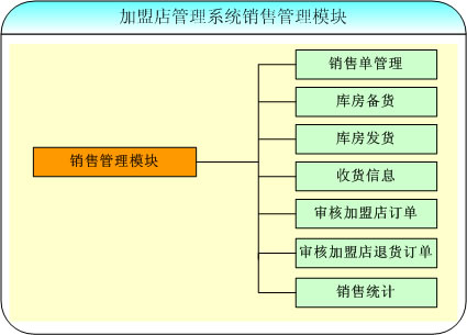 加盟店管理系統(tǒng)的銷售管理模塊是總部管理員用來執(zhí)行銷售商品、銷售下單等操作,包括了銷售單管路、庫房備貨、庫房發(fā)貨、收貨情況、審核加盟店訂單、審核加盟店退貨單、銷售統(tǒng)計等功能,該模塊是加盟店管理系統(tǒng)中一個重要的組成部分。